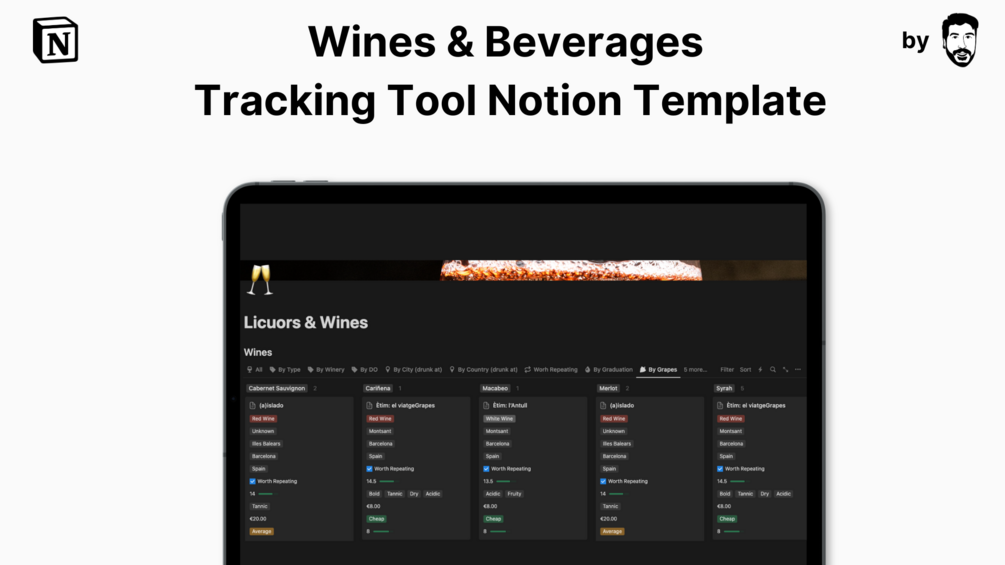 With this powerful tool, you can effortlessly log your wine tastings, categorize them by factors like graduation, designation of origin, grapes, taste, and price. This template provides detailed views so you can have a comprehensive overview of your wine collection and tasting experiences.
